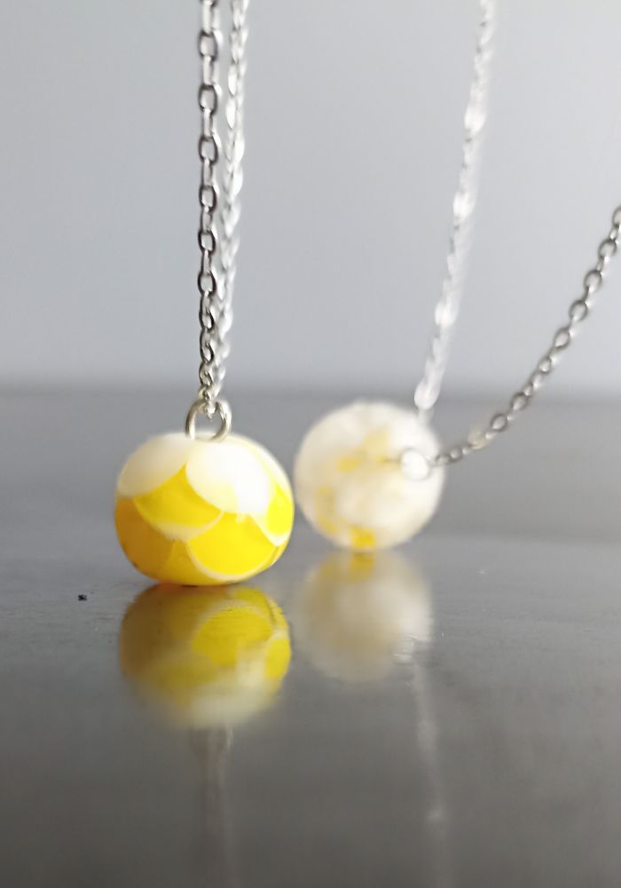 Cette perle est une célébration de la nature et de sa richesse. J’y incruste de petites fleurs en verre, façonnées à la main, comme une graine qui germe et s’épanouit dans la matière. Chaque bijou devient ainsi une touche de couleur et de délicatesse, rendant hommage à la force et à la beauté de la terre.