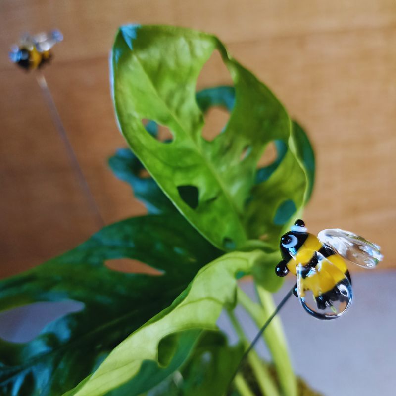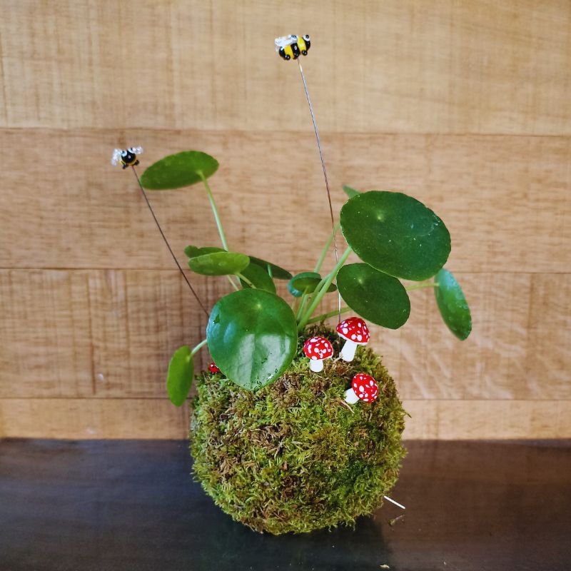 Ce grand kokedama (taille M) se pare de 5 décors en verre filé : 3 amanites et 2 abeilles.