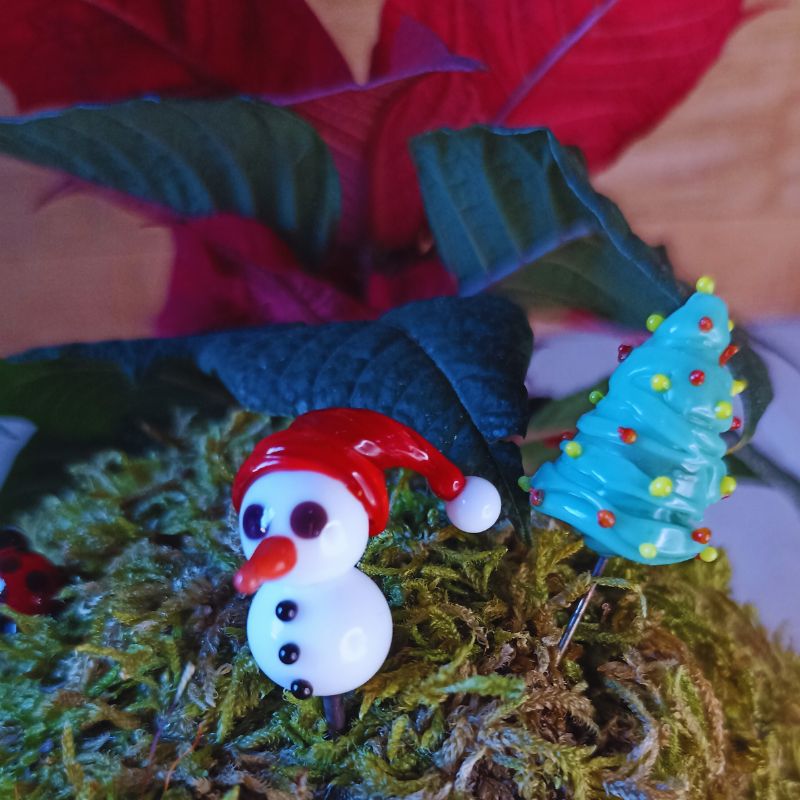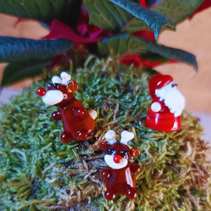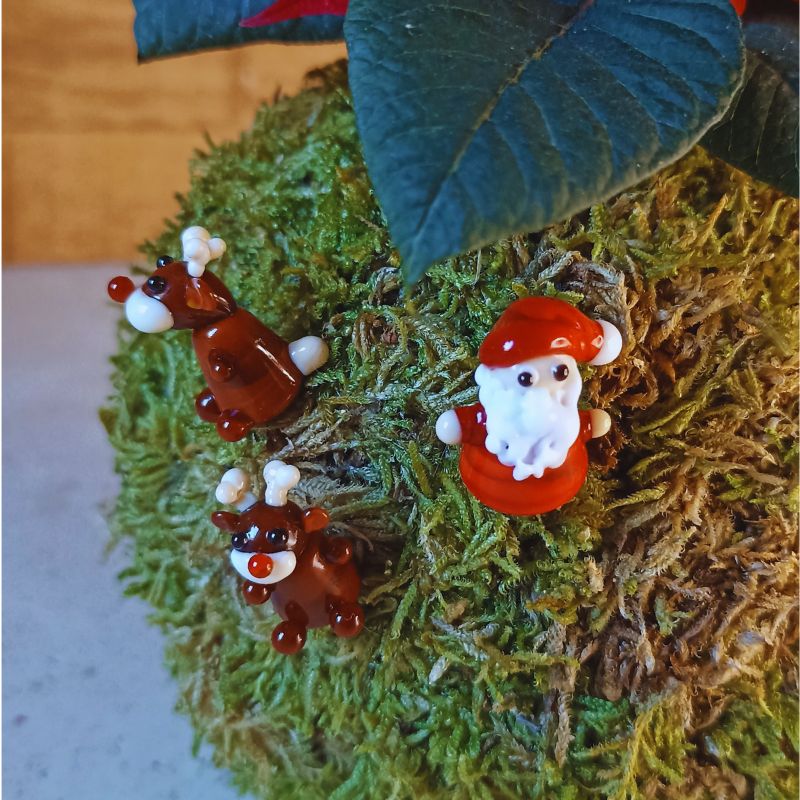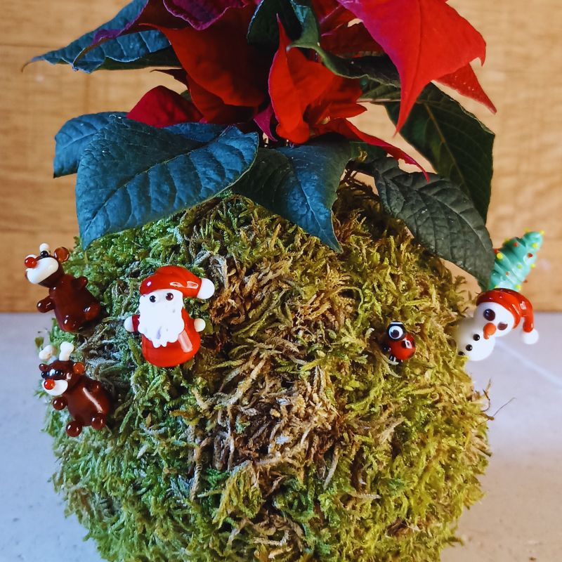 Chaque kokedama est décoré de 5 petits éléments féeriques (père Noël, rennes, bonhomme de neige et sapin) pour une scène hivernale pleine de douceur.